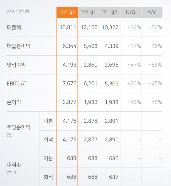 순이익은 2조8768억 원(순이익률 21%)으로 전분기보다 45%, 2021년 같은 기간보다 45% 늘었다.