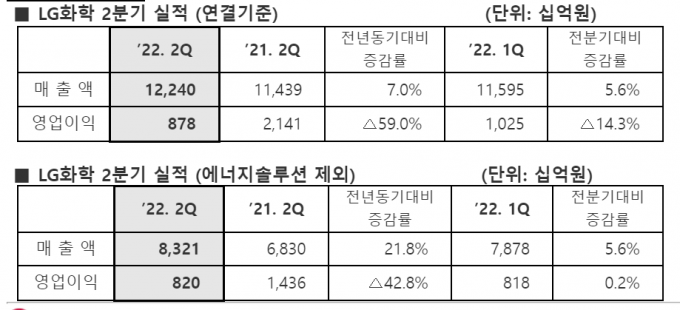 LG화학은 27일 2분기 실적발표회를 열고 올해 2분기 영업이익이 전분기 대비 14.3%,  전년 동기대비 59% 감소한 8785억원을 기록했다고 밝혔다. 2분기 매출은 전분기 대비 5.6%, 2021년 같은 기간 보다 7.0% 증가한 12조 2399억원이었다.