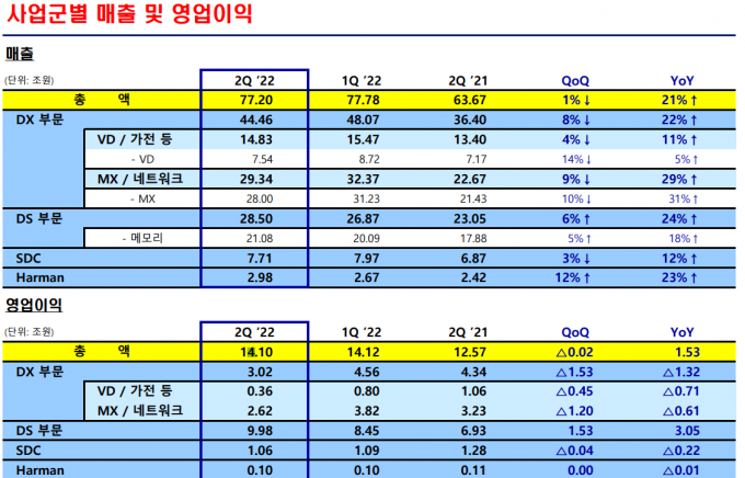 스마트폰과 TV는 원재료와 환율 상승으로 부품 단가와 물류 비용이 증가한 탓에 이익이 좋지 못했다. 실적은 갤럭시S22와 대화면 태블릿 등 고사양 플래그십 제품들이 올렸다. 갤럭시S22 울트라 모델과 대화면을 채용한 갤럭시탭 S8 시리즈가 매출에 도움이 됐다.