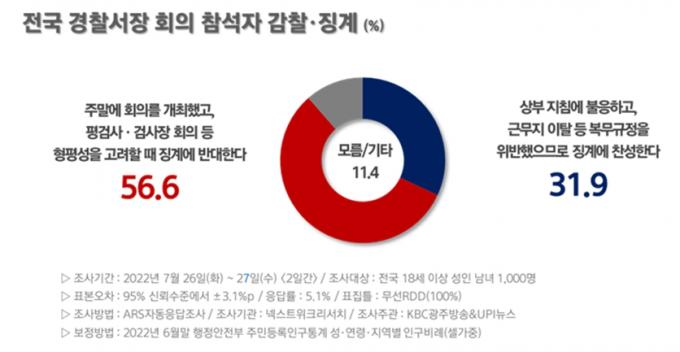 UPI뉴스·KBC광주방송이 넥스트위크리서치에 의뢰해 지난 26일, 27일 이틀간 전국 만 18세 이상 1000명을 대상으로 7월 5주차 공동 여론조사를 실시한 결과 '주말에 회의를 개최했고 평검사·검사장 회의 등 형평성을 고려할 때 징계에 반대한다'는 응답은 56.6%를 기록했다. 국민 10명 중 6명 가까이 반대하는 셈이다.
