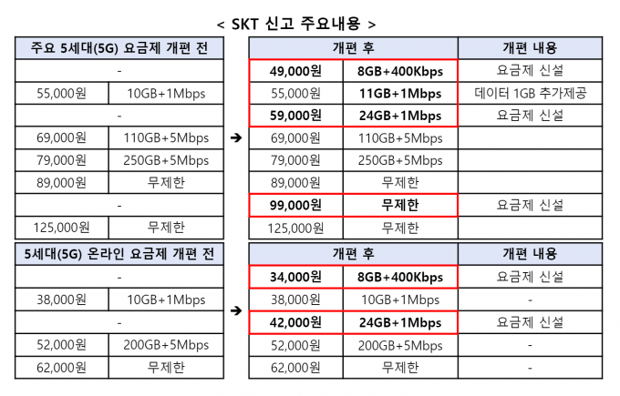 SK텔레콤은 데이터 10GB와 100GB사이에 월 5만9000원인 24GB 구간을 마련하고 데이터 소량 사용자를 위해 월 4만9000원인 8GB 구간을 신설했으며 데이터 무제한 구간에 9만9000원 요금제를 만들어 8만9000원과 12만5000원 사이의 공백을 메웠다.