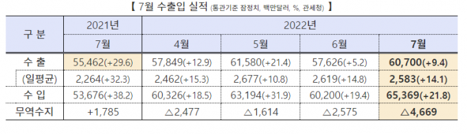 수출은 자동차와 반도체 등 주요 품목이 판매 호조를 보이며 역대 7월 중 최대치를 기록했지만 수입도 급증해 무역 적자에 이르렀다. 러시아·우크라이나 전쟁이 장기화되면서 글로벌 공급망의 불안정성이 심화되고 에너지와 원자재 가격이 급등한 탓이다.