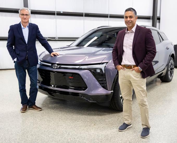 ▲ 실판 아민 GM 해외사업부문 사장(오른쪽)과 로베르토 렘펠 한국GM 사장이 7월27일(현지시간) 미국 MPG에서 블레이저 EV 쇼카 앞에서 포즈를 취하고 있다. [GM 제공]