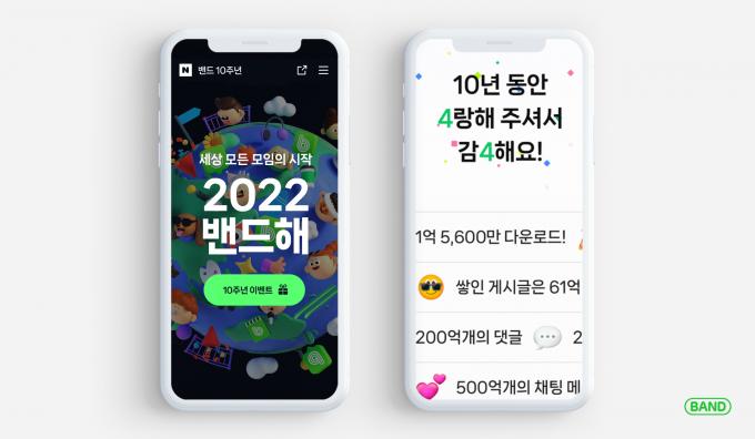 오는 21일까지 밴드 10주년 축하 이벤트도 진행한다. 10주년 이미지를 저장하거나 캡처해 메시지와 함께 SNS에 인증하면, 총 1500명에게 네이버페이 포인트를 지급한다. 10주년 페이지에서 추천 밴드에 가입하면 총 3명에게 아이폰 13을, 총 1000명에게 네이버페이 포인트를 지급할 예정이다.
