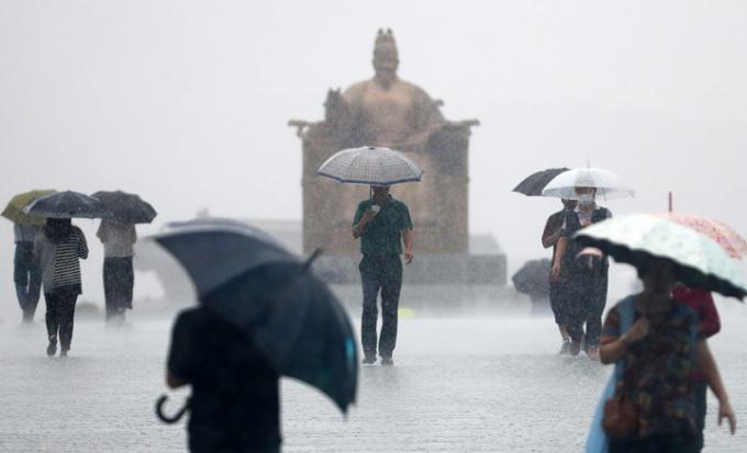 ▲ 8일 오후 서울 종로구 광화문 광장에서 우산을 쓴 시민들이 발걸음을 재촉하고 있다. [뉴시스]