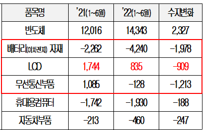 대중 무역적자에는 디스플레이 등 산업 구조가 중국 중심으로 재편된 것도 영향을 미친 것으로 풀이됐다. 중국의 저가공세로 한국 사업이 축소되는 LCD의 경우 2022년 상반기 수입이 12.9억 달러로 전년도 4.5억 달러보다 3배 가까이 증가했다. 무역수지도 17.4억 달러에서 8.3억 달러로 감소했다.