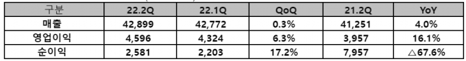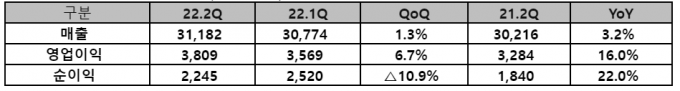 별도 재무제표 기준 2022년 2분기 매출은 3조1182억원, 영업이익 3809억원이었다. 전년 같은 기간과 비교하면 각각 3.2%, 16% 성장한 수치다. 회사측은 유무선통신 사업을 중심으로 클라우드 솔루션 등 엔터프라이즈 사업이 힘을 보탰다고 설명했다.
