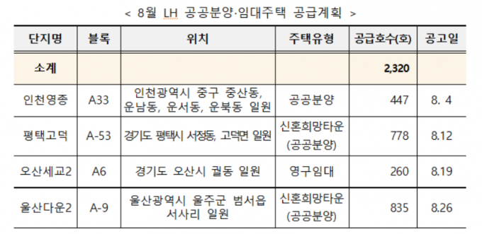 공공분양 아파트 447가구가 '인천 영종A33블록'에서 분양되고, '평택 고덕지구 A-53블록'과 '울산 다운2지구 A-9블록'에서 각각 778가구와 835가구의 신혼희망타운 공공분양이 공급된다.