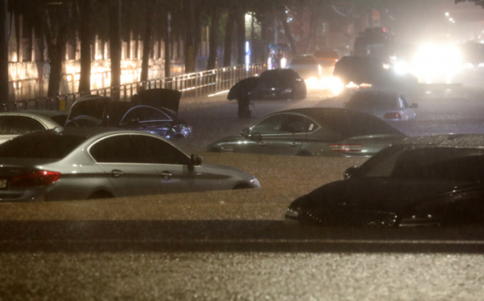 ▲ 서울과 경기북부 등 수도권에 폭우가 내린 8일 오후 서울 강남구 일대 도로가 침수돼 차량이 잠겨 있다. [뉴시스]
