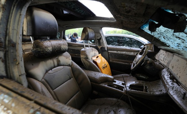 ▲ 손해보험사 관계자가 지난 14일 경기 과천 서울대공원 주차장에서 침수차량을 살펴보고 있다. [뉴시스]