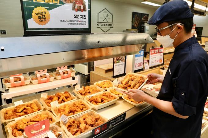 이마트는 지난달 5분 치킨을 내놓은 후 델리 치킨 매출이 전년 동월보다 26% 늘었다. 지난달 14일부터 2주 동안에는 가격을 3000원 낮춰 6980원에 판매했다.