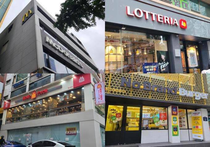 ▲ 서울에 있는 맥도날드(왼쪽 위부터 시계방향), 롯데리아, 노브랜드 버거, 맘스터치 매장. [김지우 기자]
