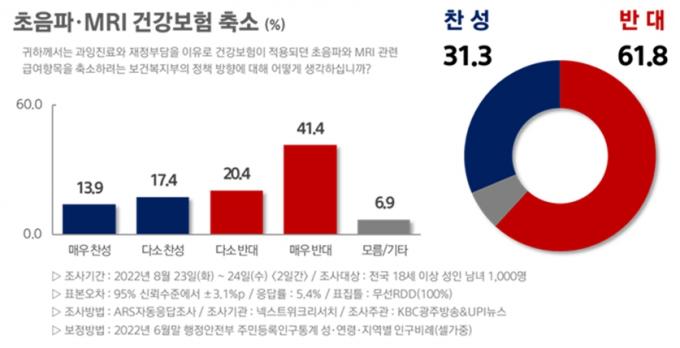 UPI뉴스·KBC광주방송이 넥스트위크리서치에 의뢰해 지난 23, 24일 이틀간 전국 만 18세 이상 1000명을 대상으로 8월 4주차 여론조사를 실시한 결과 '과잉진료와 재정부담을 이유로 건강보험이 적용되던 초음파와 MRI 관련 급여항목을 축소하려는 보건복지부의 정책 방향에 대해 어떻게 생각하냐'는 질문에 "반대한다"는 응답은 61.8%를 기록했다.