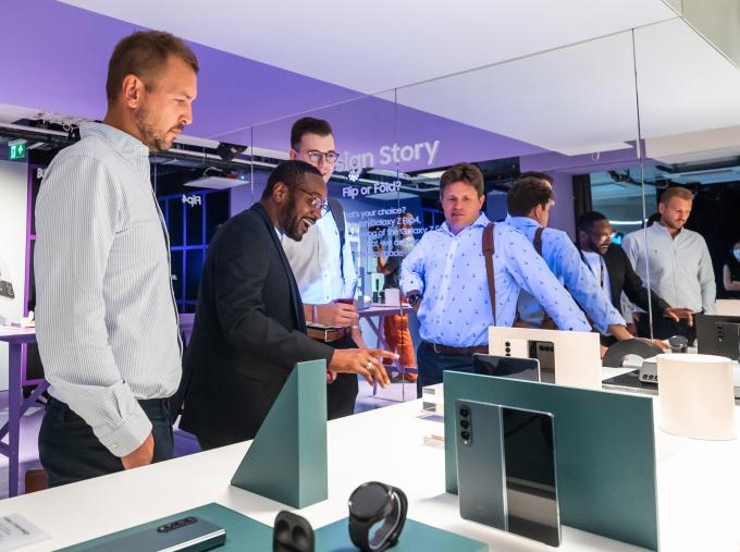 ▲8월 11일(현지시간) 영국 런던 피카딜리 광장에 마련된 갤럭시 Z 플립4·Z 폴드4 팝업 스토어에서 현지 미디어, 거래선, 소비자들이 제품을 체험하고 있다. [삼성전자 제공]