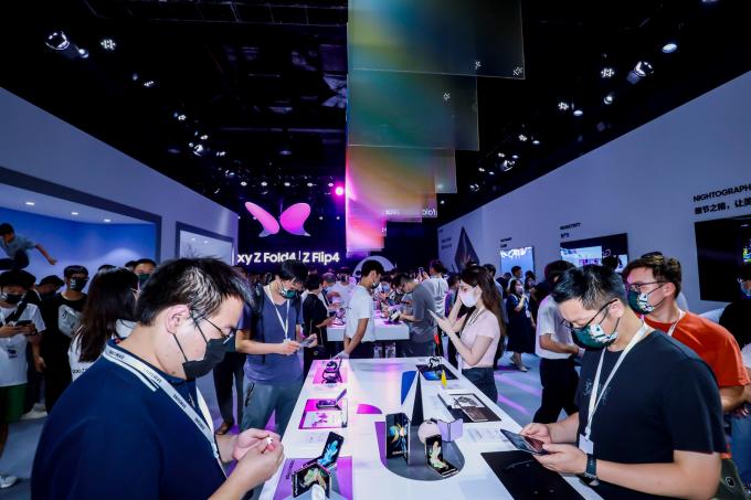 ▲8월 22일(현지시간) 중국 항주(杭州)의 E-FASHION TOWN(패션타운)에서 진행된 갤럭시 Z 플립4·Z 폴드4 공개 행사에서 소비자들이 제품을 체험하고 있다. [삼성전자 제공]