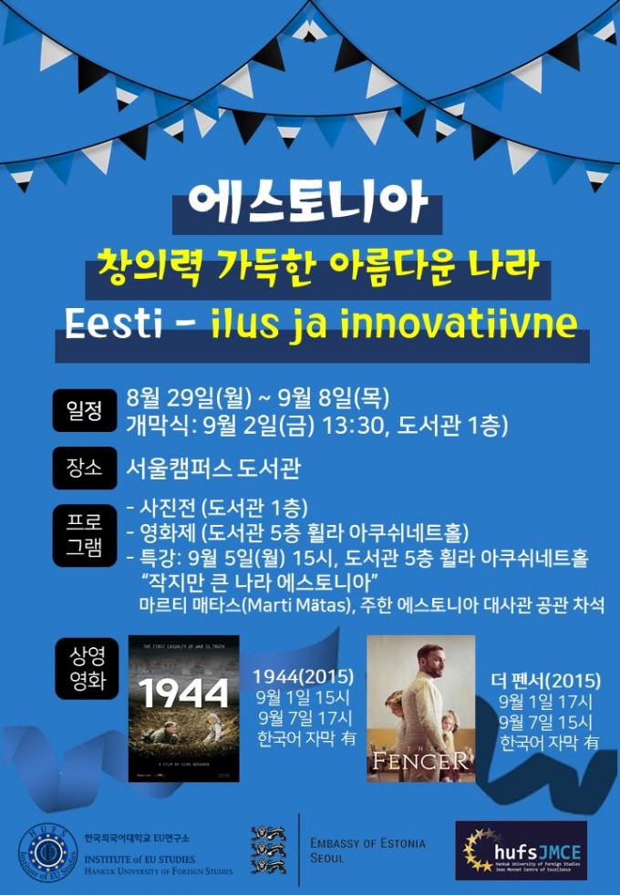 한국외대 EU연구소 주최 문화 교류 프로그램 한국외국어대학교가 주한 에스토니아 대사관과 공동으로 지난 29일부터 9월 8일까지 한국외대 서울캠퍼스 스마트도서관에서 "에스토니아, 창의력 가득한 아름다운 나라(Eesti - ilus ja innovatiivne)"를 주제로 사진전, 영화제 등 '에스토니아 주간' 행사를 개최한다고 30일 밝혔다.