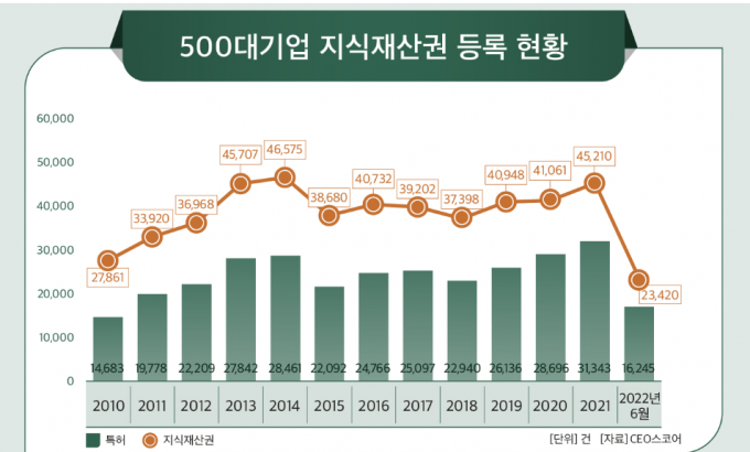 31일 CEO스코어 발표에 따르면 지식재산권 등록은 꾸준한 증가세다. 특히 2019년 이후 대기업들의 지식재산권 등록은 연간 4만건을 넘어서고 있다. 올 상반기 등록 건수도 2만3420건이나 됐다.