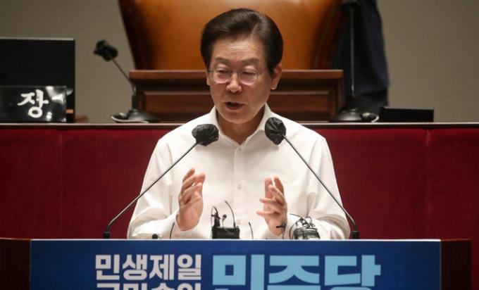 ▲ 더불어민주당 이재명 대표가 지난달 31일 국회에서 열린 국회의원 워크숍에서 인사말을 하고 있다. [뉴시스]