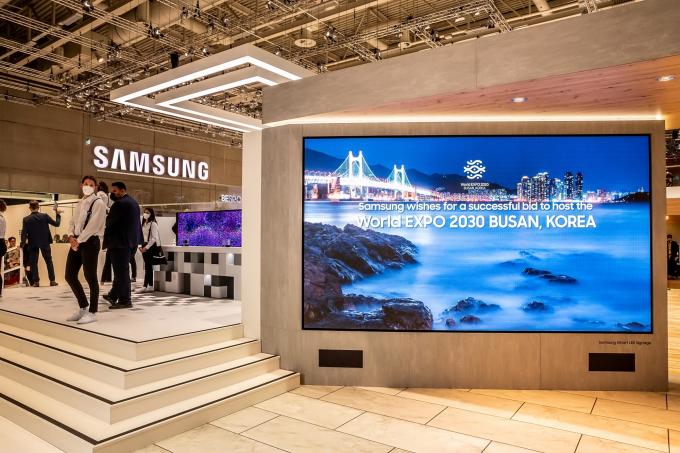 LG전자와 삼성전자는 이달 2일(현지시간) 독일 베를린에서 개막한 유럽 가전전시회 IFA2022에서도 부산세계박람회 유치 활동을 진행 중이다. 깃발과 전광판 등으로 부산엑스포를 홍보하고 있다.