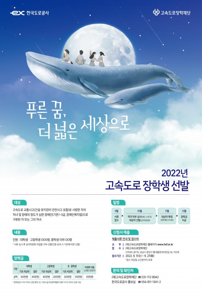 장학생 선발대상은 고속도로 교통사고 또는 건설·유지관리 업무 중 발생한 사고로 사망한 사람의 자녀, 사고로 중증장애인 판정을 받은 본인 또는 그의 자녀다.