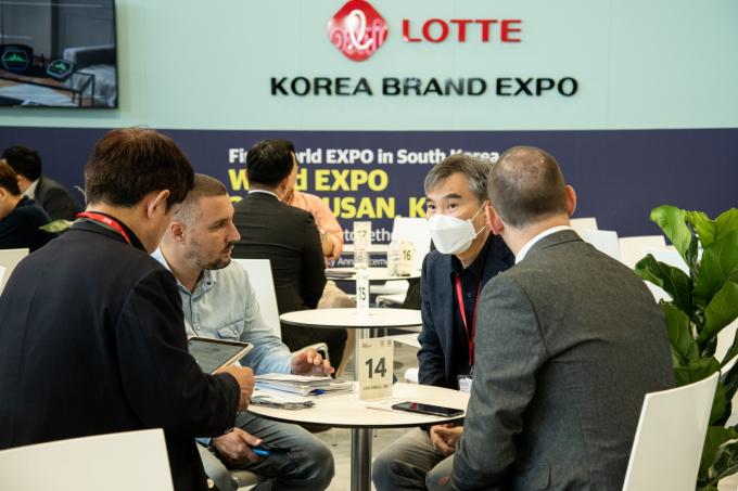 ▲ 롯데홈쇼핑이 독일 베를린에서 진행한 '대한민국 브랜드 엑스포' 수출 상담회에서 국내 중소기업 관계자가 현지 바이어들과 수출 상담을 하고 있다. [롯데홈쇼핑 제공]