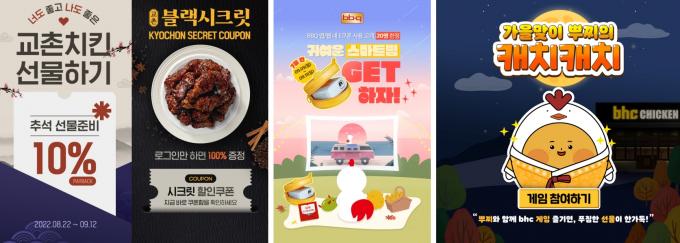 BBQ치킨은 BBQ앱 회원에게 경품을 제공한다. 오는 11일까지 E쿠폰(기프티콘)을 사용한 20명을 추첨해 40만 원 상당의 빔 프로젝터를 증정한다. bhc치킨은 오는 28일까지 약 3주간 공식 홈페이지 및 소셜미디어 채널, 자사 앱 내 미니 게임 '가을맞이 뿌찌의 캐치캐치' 참여자에게 경품을 제공한다.
