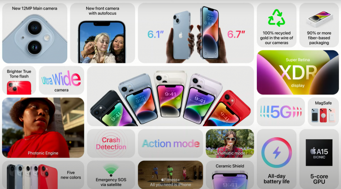아이폰14는 화면 크기가 6.1인치인 아이폰14와 아이폰14 프로, 6.7인치인 아이폰14 플러스와 아이폰14 프로맥스 4가지 모델로 나왔다. 화면이 작은 미니 모델은 출시하지 않았다.