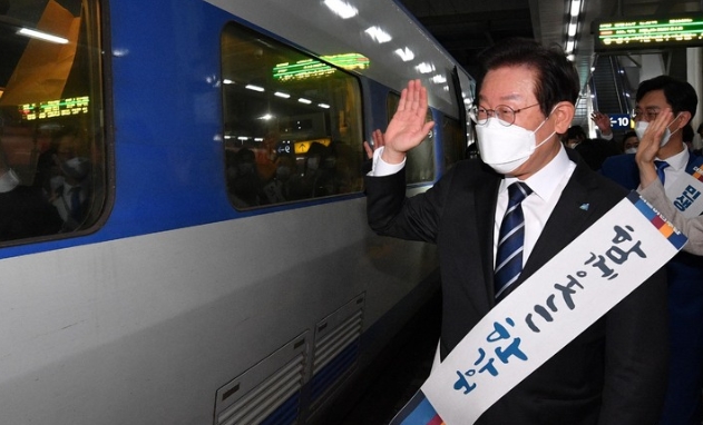 ▲ 이재명 더불어민주당 대표가 8일 오전 서울 용산역에서 추석 귀성객들에게 인사를 하고 있다. [뉴시스]