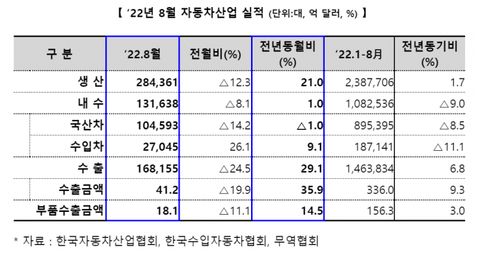 친환경차 수출은 47.0% 증가 올해 8월 자동차 생산과 수출, 내수가 모두 증가세로 돌아섰다. 2021년 2월 이후 1년 7개월 만이다.