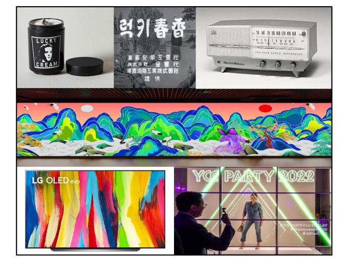 ▲ (좌측상단부터 시계방향순)으로 락희화학공업사 '럭키크림', 락희화학공업사 '럭키춘향편' 광고, 금성사 'A-501' 라디오, LG전자 LED 사이니지(경주 세계유산 미디어 홍보관 '살롱 헤리티지'), LG디스플레이 투명 OLED(미국 뉴욕 구겐하임 뮤지엄 'YCC PARTY'), LG전자 올레드 TV. [LG그룹 제공]