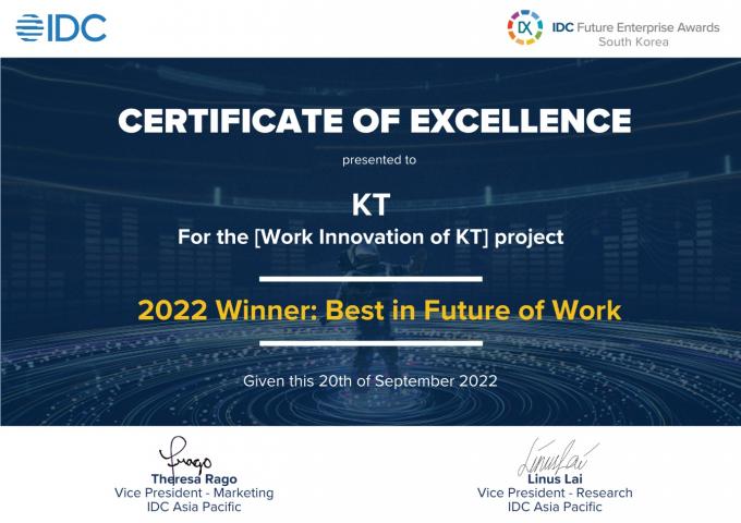 한국IDC 한은선 지사장은 "KT는 '디지코' 비전 구현을 위해 업무 방식과 직원 경험을 혁신하려는 의지를 보여줬으며, 기술을 활용해 일하는 방법을 재구성하고, 확장·자동화하는 동시에 조직 내에 새로운 가치창출의 기회를 만든 점을 높이 평가했다"고 말했다.