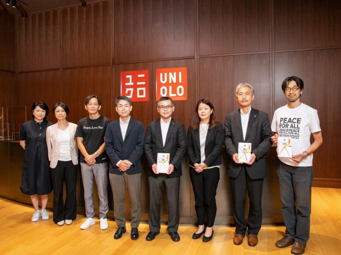 ▲ 야나이 코지 패스트리테일링 수석 경영 책임과 지속가능경영 총괄 임원(왼쪽 네 번째)이 지난 20일 'PEACE FOR ALL(모두를 위한 평화)' 프로젝트 기부금 전달식을 진행했다. [유니클로 제공]