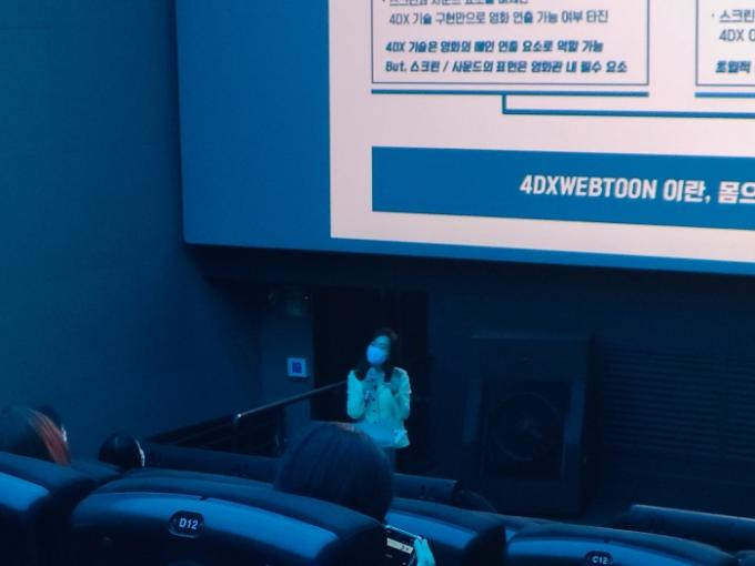 ▲ 윤현정 CJ 4DPLEX 총괄 프로듀서가 지난 29일 CGV용산아이파크몰에서 열린 '문유' 시사회에서 발표하고 있다. [김지우 기자]