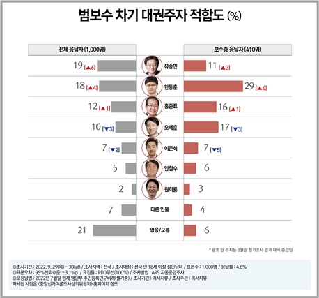여론조사기관 리서치뷰가 지난달 29, 30일 이틀간 전국 18세 이상 1000명을 대상으로 조사해 3일 발표한 결과 범보수 차기 대권주자 적합도로는 △유승민(19%) △한동훈(18%) △홍준표(12%)가 선두권을 형성했다. 이어 오세훈(10%) △이준석(7%) △안철수(5%) △원희룡(2%) 순이었다.