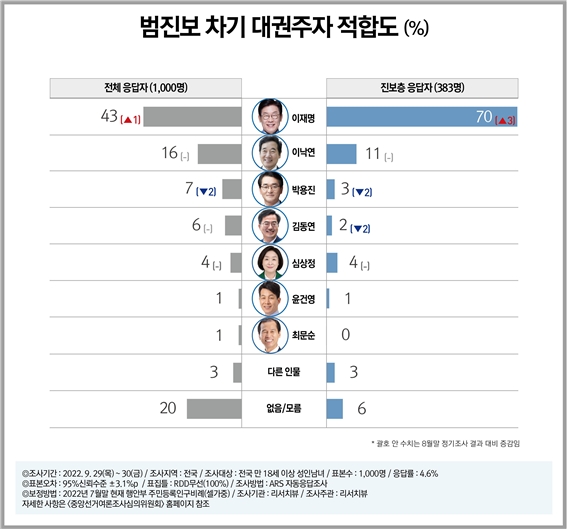 범진보 차기 대권주자 적합도는 이재명 대표가 43%였다. 그 다음으로는 이낙연(16%) △박용진(7%) △김동연(6%) △심상정(4%) △윤건영·최문순(1%), 기타/무응답(23%) 순이었다. 8월 대비 이재명 대표는 1%p 올랐고, 박용진 의원은 2%p 내렸다.