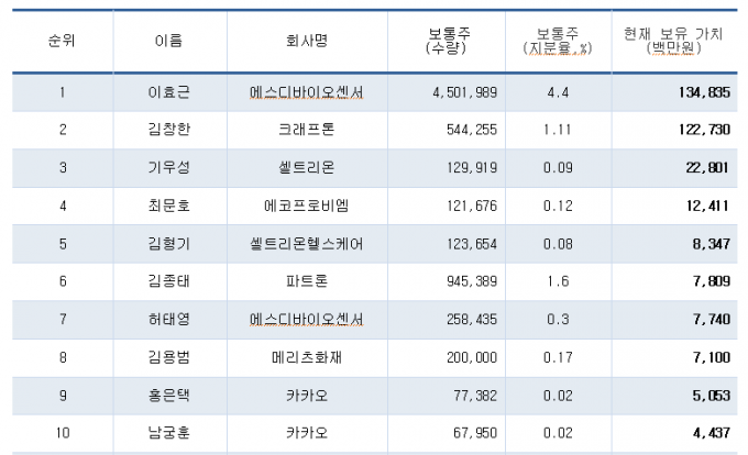이 외 전문 김형기 셀트리온헬스케어 대표 부회장(83억 원), 김종태 파트론 대표 사장(78억 원), 허태영 에스디바이오센스 대표(77억 원), 김용범 메리츠화재 대표 부회장 (71억 원), 홍은택 카카오 대표(50억 원), 남궁훈 카카오 대표(44억 원)도 자사주를 많이 가지고 있었다.