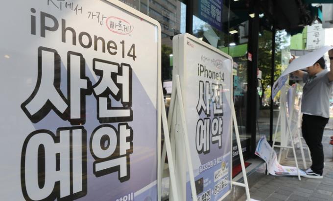 ▲ 애플의 신제품 아이폰14 시리즈 국내 사전예약이 시작된 지난달 30일 서울 중구 한 통신사 매장에서 직원이 홍보 포스터를 게시하고 있다. [뉴시스]