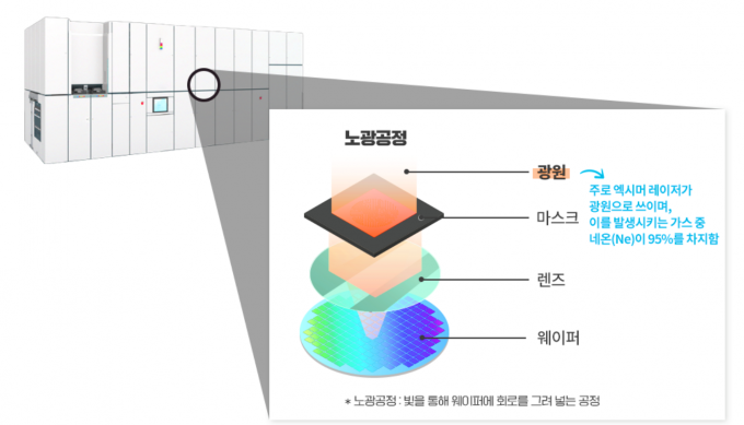 네온은 반도체 노광공정에 사용되는 엑시머 레이저 가스(Excimer Laser Gas)의 주재료다. 엑시머 레이저 가스는 매우 짧은 파장의 자외선인 엑시머 레이저를 발생시키고 이는 반도체의 재료인 웨이퍼 위에 미세한 회로를 새길 때 쓰인다.