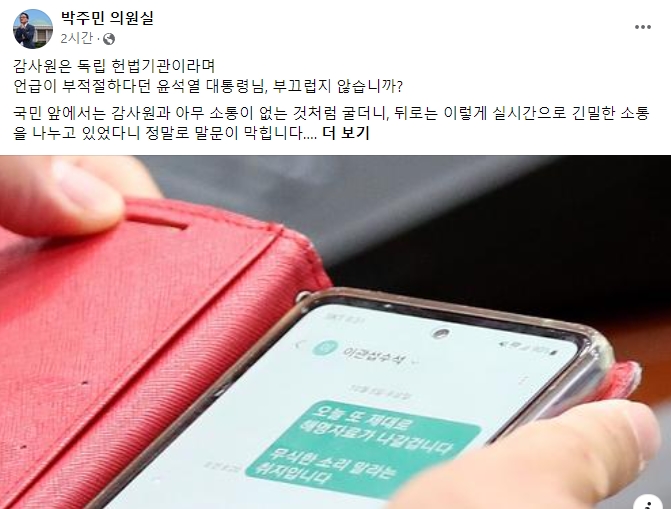 박주민 의원은 "한두 번 문자를 주고받은 것 같지 않다. 그동안 정치감사, 표적감사에 대통령실의 개입이 있었다고 의심할 수밖에 없다"고 했다.