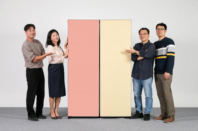 ▲ 삼성전자 생활가전사업부 CX팀 이보나 상무와 팀원들이 인간공학디자인상 '그랑프리'를 수상한 비스포크 1도어 냉장고를 소개하고 있다. [삼성전자 제공]
