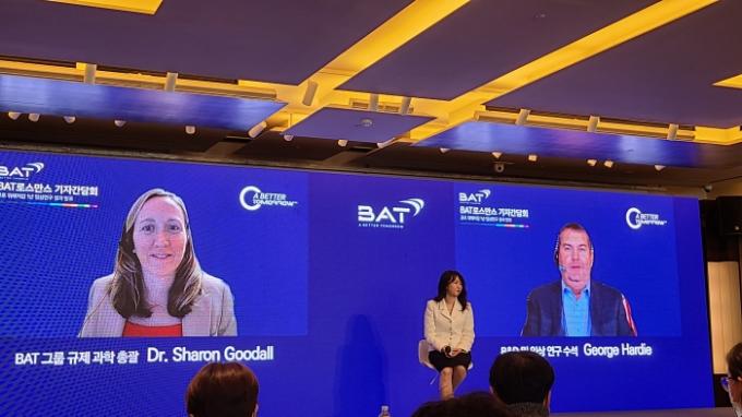 왼쪽부터 샤론 구달 BAT그룹 규제 과학 총괄, 김은지 BAT로스만스 대표, 조지 하디 R&D 및 임상 연구 수석. [김지우 기자]
