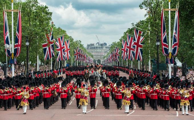 ▲ 영국 왕실 근위대 군악대가 런던 버킹엄궁 교대식에서 연주하고 있다. [롯데물산 제공]