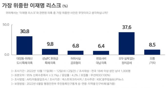 '가장 위중한 이재명 리스크'로는 '대장동·위례신도시 특혜 의혹'에 이어 △ 성남FC 후원금 특혜 의혹 9.8% △ 허위사실 공표혐의 6.8% △ 변호사비 대납 의혹 6.4% 순이었다.
