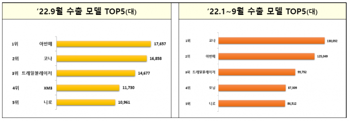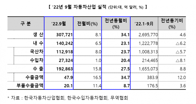 14일 산업통상자원부가 발표한 '2022년 9월 자동차 산업동향'에 따르면 생산(34.1%)과 내수(23.1%), 수출(27.5%)이 전년 같은 달보다 크게 증가했다. 수출액도 34.7%나 늘었다.
