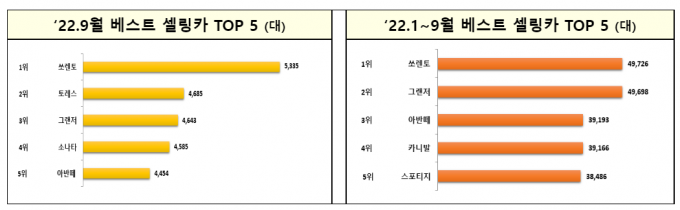 베스트 셀링카(승용)는 상위 5위까지를 모두 국산차가 차지했는데 토레스가 출시 3개월 만에 베스트 셀링카 2위로 등극했다.