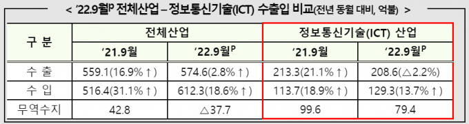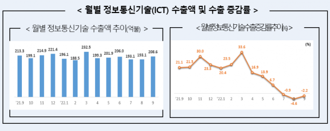 14일 과학기술정보통신부에 따르면 9월 ICT 수출은 208억6000억 달러를 기록했다. 지난 6월(206억 달러) 이후 3개월 만에 200억 달러 회복이다.