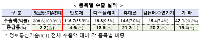 전체 산업 수출 내에서 차지하는 비중은 2016년 7월 이후 30% 이상을 지속 유지하고 있다. 전체산업(574억6000만 달러) 중 ICT 수출 비중은 36.3%다.