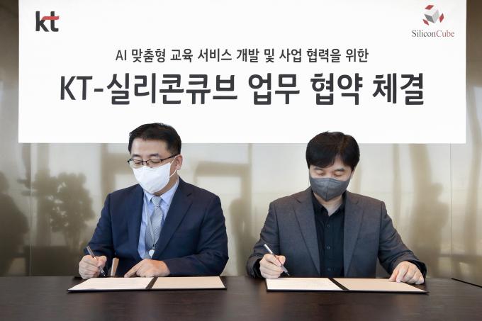 KT(대표 구현모)가 국내 AI 강소기업 실리콘큐브(대표 임종윤)와 AI 기반 맞춤형 교육 서비스 개발 및 사업협력을 위한 양해각서(MOU)를 체결했다고 14일 밝혔다.