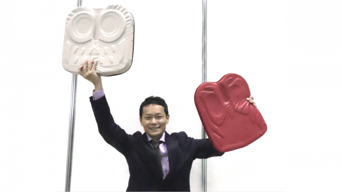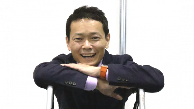 ▲ 오가와 가나메 가지 사장이 10월5일 도쿄 빅사이트에서 열린 국제복지기기전에서 자사 제품을 들고 환하게 웃고 있다. [서창완 기자]