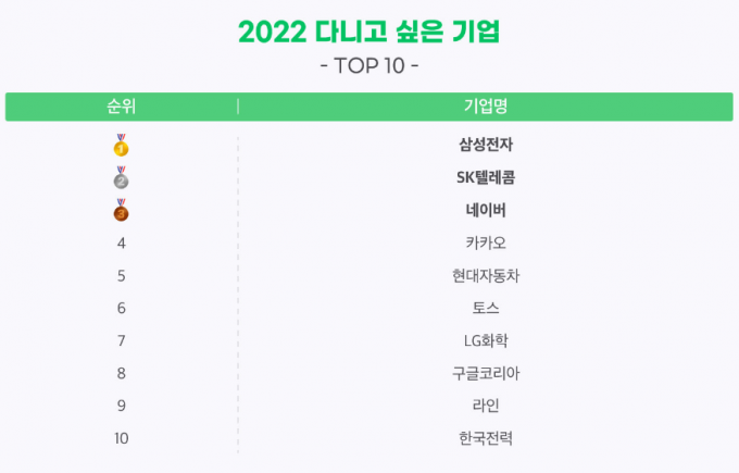 17일 기업 정보 플랫폼 잡플래닛이 취업 준비생 1013명을 대상으로 '2022년 다니고 싶은 기업'을 물은 결과 △삼성전자 △SK텔레콤 △네이버 △카카오 △현대자동차 △토스 △LG화학 △구글코리아 △라인 △한국전력이 상위 10개 기업으로 선정됐다.